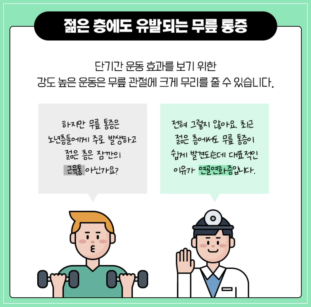 - 과체중: 체중이 많이 나갈수록 무릎에 가해지는 압력이 커져 연골 손상이 더 빨리 일어납니다.