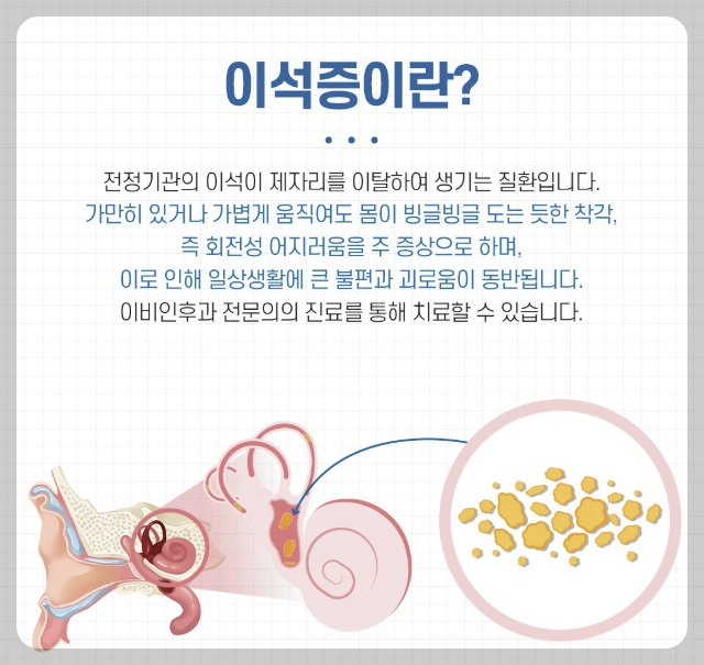 이석증(또는 양성 돌발성 체위성 어지럼증, BPPV)은 귀 속에 있는 이석(작은 칼슘 결정체)이 정상 위치에서 떨어져 나와 귓속의 평형기관에 들어가 어지럼증을 유발하는 질환입니다. 이석증은 갑작스럽게 발생해 일상에 큰 불편을 줄 수 있지만, 비교적 치료가 쉬운 편입니다. 이석증의 주요 원인, 증상, 치료법을 다음과 같이 자세히 살펴보겠습니다.