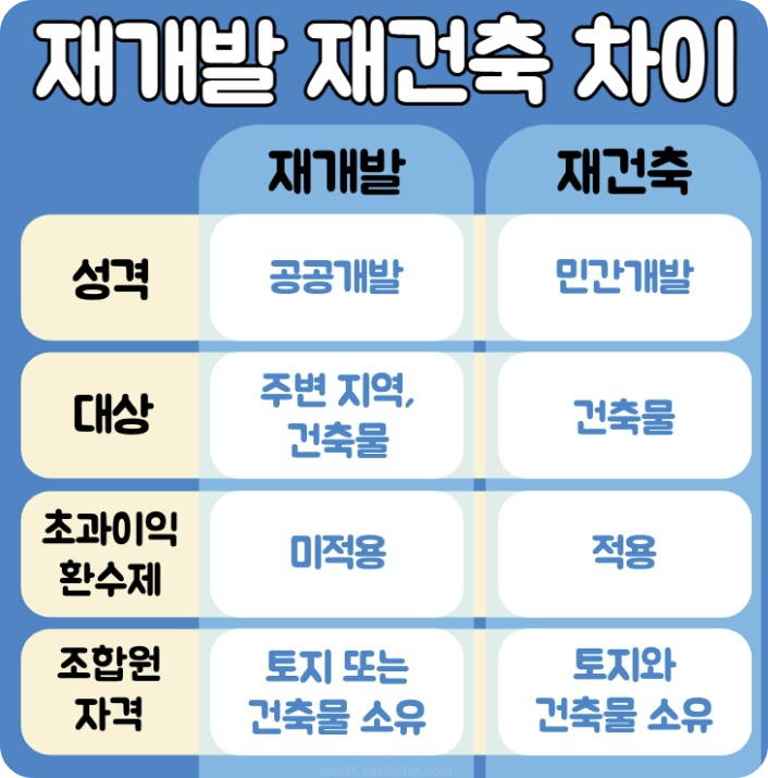 | 인허가 과정 | 정비구역 지정 → 추진위 승인 → 조합 설립 → 사업시행 인가 → 관리처분계획 → 착공 | 안전진단 → 조합설립 → 사업시행 인가 → 관리처분계획 → 착공 |