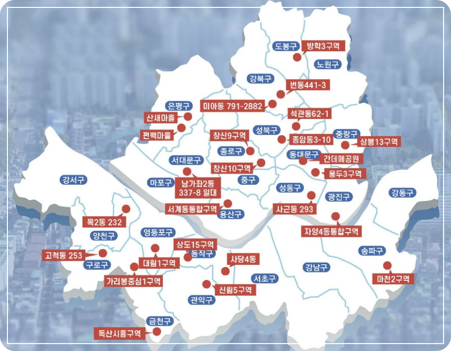 2025년 현재 서울시에서 주목받고 있는 주요 재개발·재건축(정비) 구역은 아래와 같습니다. 정비가 본격화되거나 토지거래허가구역으로 지정되어 관리 및 투기 규제 대상이 되는 곳들이며, 서울시 정책 방향 및 시장 흐름에 따라 순차적으로 해제 또는 지정될 예정입니다.