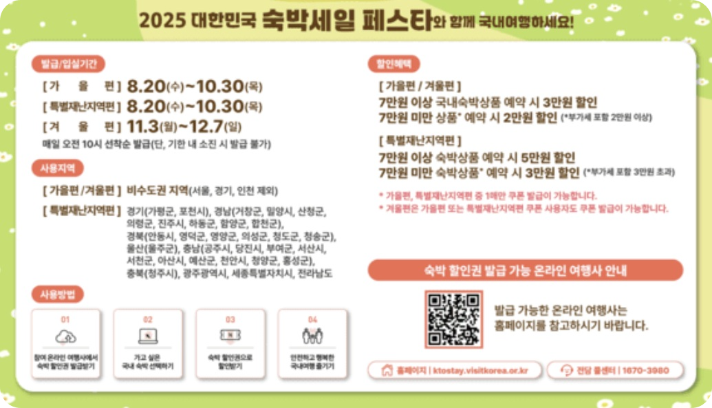 이번 숙박세일 페스타는 가을 단풍 여행, 겨울 온천 여행 등 비수도권의 숨겨진 명소를 저렴하게 탐방할 수 있는 절호의 기회입니다. 쿠폰 혜택을 놓치지 말고, 사랑하는 사람들과 함께 따뜻하고 알찬 여행을 계획해 보세요!