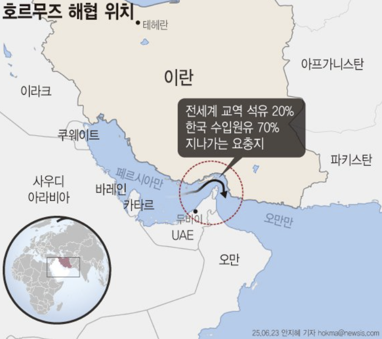 - 에너지 안보: 사우디아라비아, 쿠웨이트, UAE, 이라크 등 주요 산유국의 유조선이 반드시 거쳐야 하는 유일한 출구입니다.