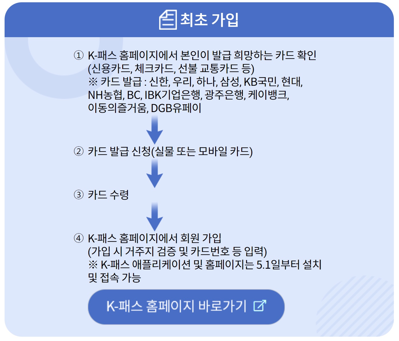카드사에서 전용카드 발급 → K패스 홈페이지 가입(korea-pass.kr)