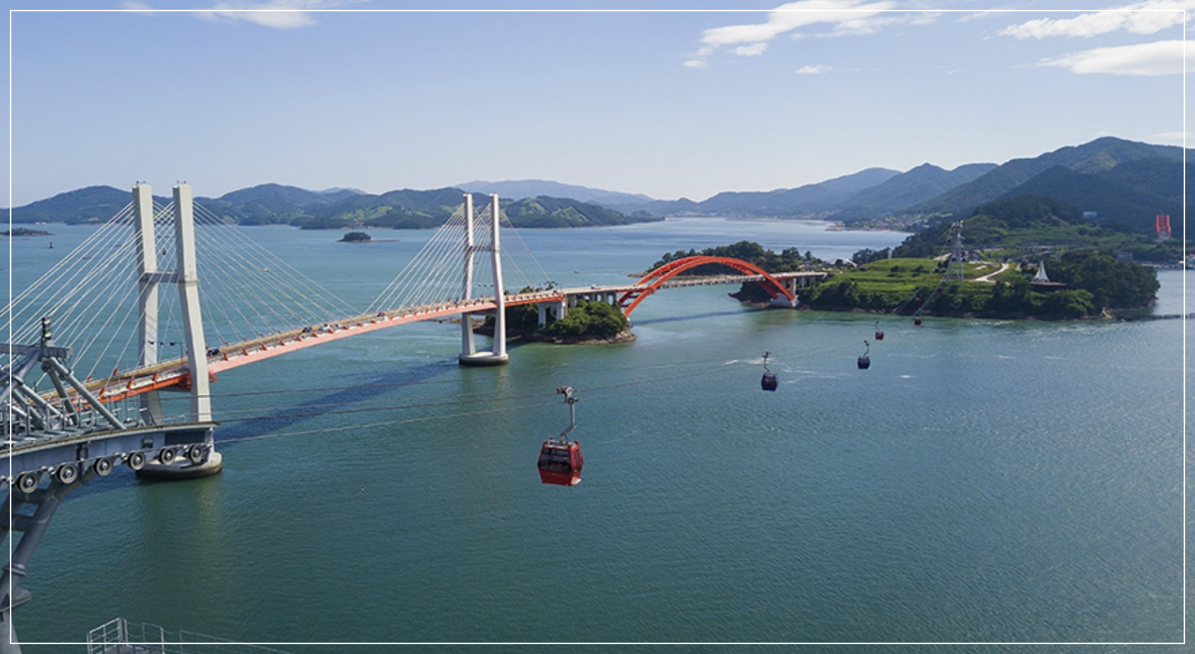 - 국내 최초로 바다(사천바다) 와 섬(초양도) , 그리고 산(각산)을 잇는 코스 구성(2.43Km,약 20분)으로 3개 정류장(대방, 초양, 각산)에서 승·하차를 할 수 있어 다양한 볼거리를 제공하고 있습니다.