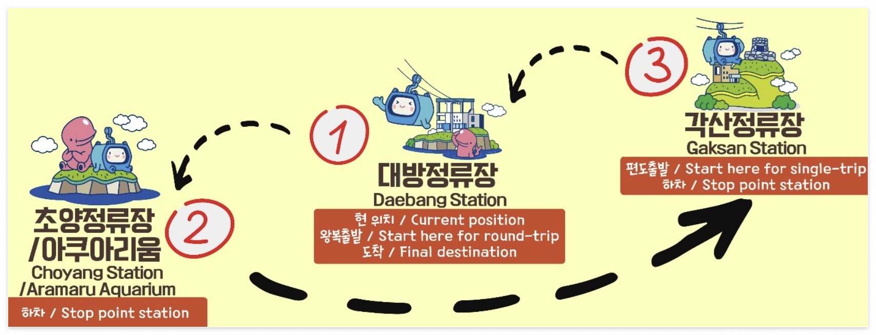 편도 탑승권은 각산 정류장에서만 이용가능하며 대방정류장에서 하차